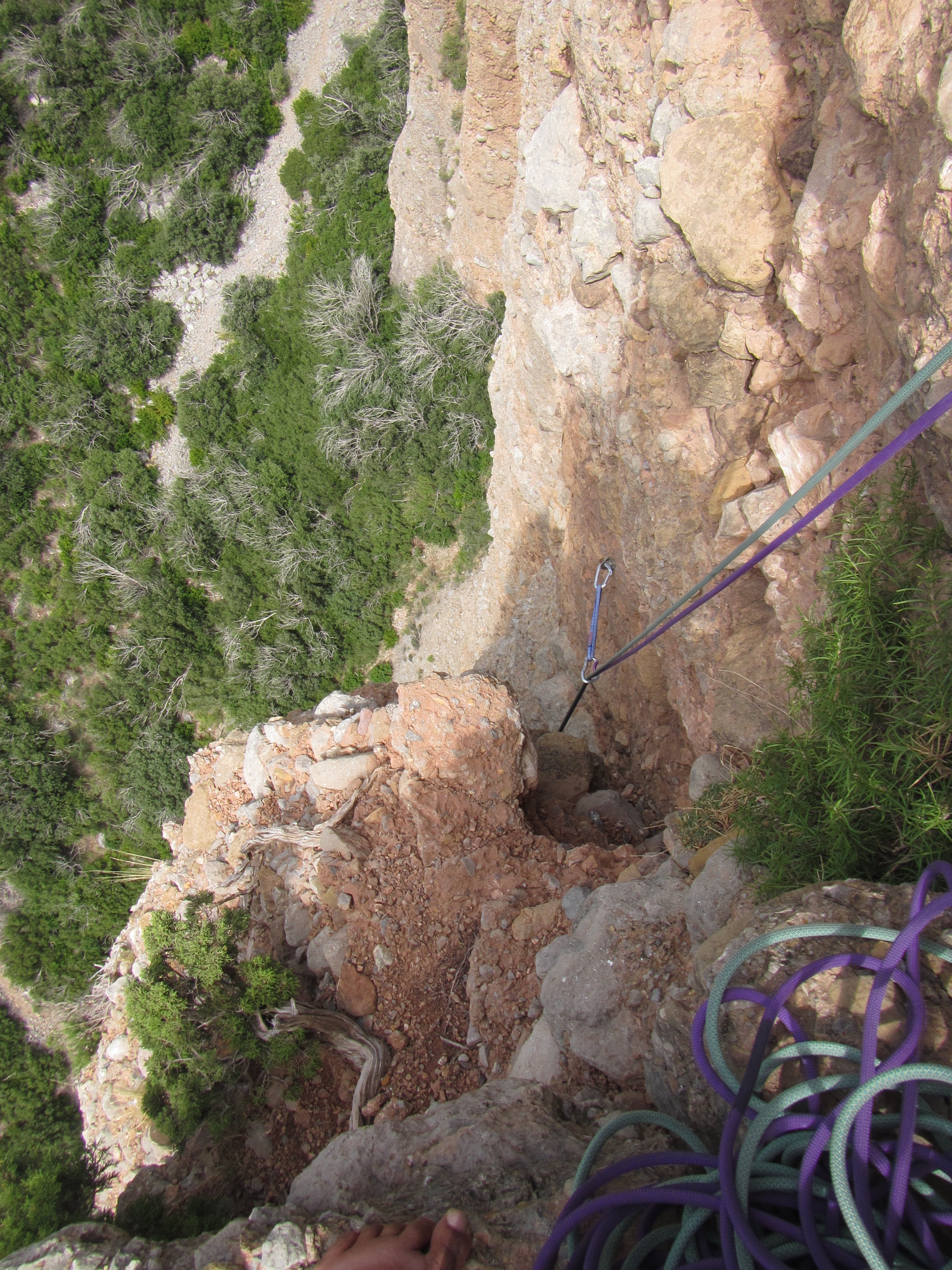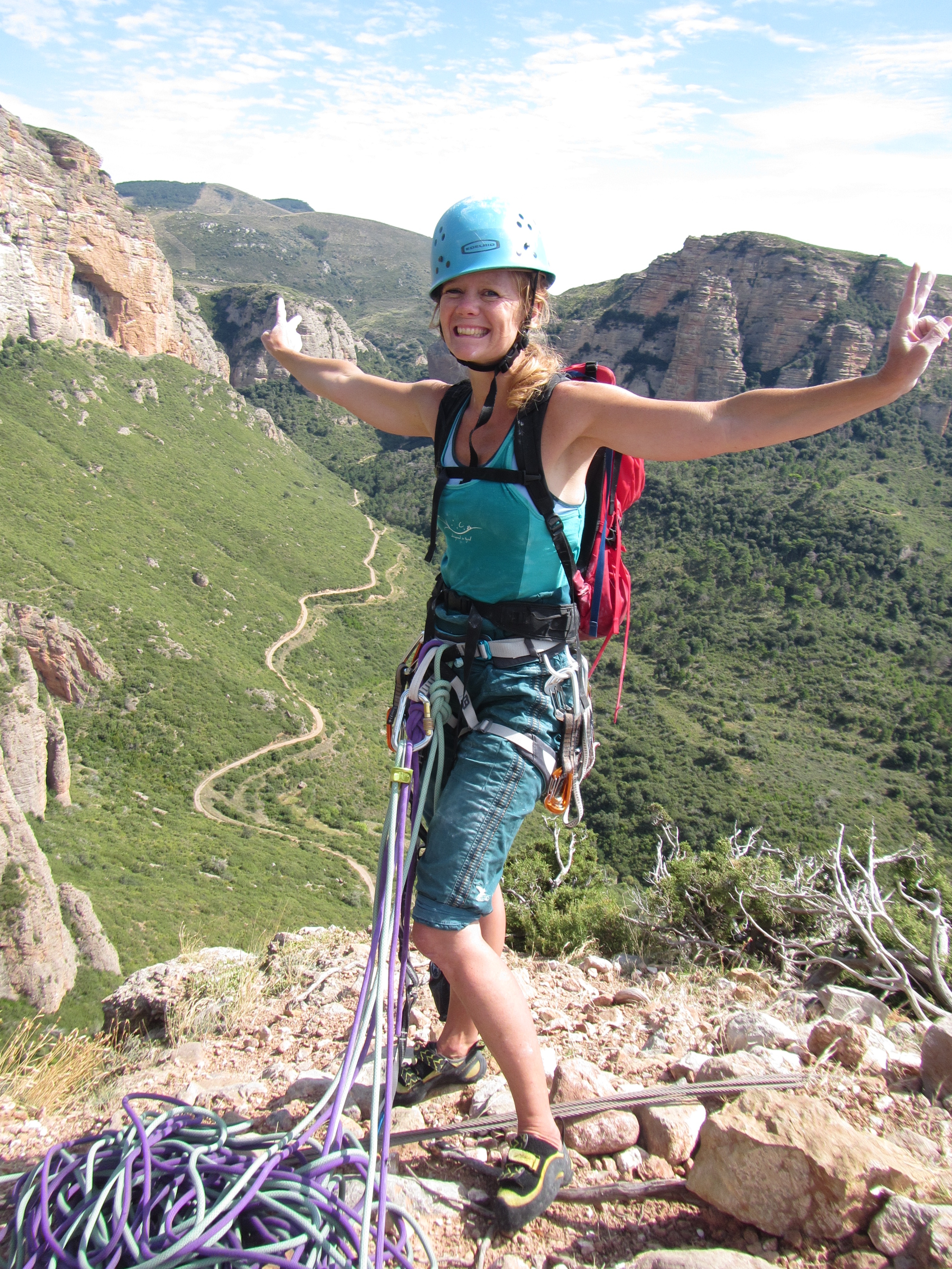 Vi hadde endelig funnet et tårn som hadde nordvendte ruter, det var ikke 300 meter høyt (beklager det Line!), men 140 meter fikk holde. Alt var klart og Line hadde startet klatringen på første taulengde da en stein smalt i bakken ikke så langt fra HP. Sånt kan jo skje og Line forsatte å klatre, men HP fulgte godt med oppover for å si det mildt. Vi hadde hørt noen stemmer og visste at det var andre på samme tårn, men det hadde hørtes ut som om de var et stykke unna. Flere steiner kom fallende, de var på størrelse med tennisballer og ingen hjelm stopper slike fra 140 meter. Line lagde snufeste på på første taulengde og kom ned igjen. Vi ble sittende og vente litt og stemmene nærmet seg. Det skulle vise seg at det var noen lokale, trolig pensjonister, som hadde vært på toppen og kom rappelerende ned like bortenfor ruten vi var på vei opp. Fasinerende! Vi hadde en slags samtale på engelsk/fransk/spansk/norsk/svensk/dansk/ting usikker på hva som ble sagt, men vi smilte og hadde det gøy. Etter at de hadde gått falt det mye mindre stein ned fra veggen.. Ruten vi hadde valgt var en så kalt miks rute hvor du må ha med engne sikringer, men det er noen bolter i veggen. Det er sportsruter i Riglos, men på lengre ruter anbefales det å ha med egne sikringer i tillegg selv om det er ren sportsrute. Vår rute var altså benevnt som miks rute, men vi endte opp med å gå alle taulengdene kun på boltene som var i veggen, noe som var veldig spennende. Også fordi det var vanskelig å finne boltene og taulengdene var førti meter lange. Det gjorde det ikke mindre spennede at både over og under oss sirklet det svære ørner og gribber. Toppen var spiss, fin og her var det ikke plass til mange. Det hører med til historien at Line, hadde før vi reiste, ønske om å klatre et tårn på 40 meter i Siruana. Kanskje unødvendig å si at hun var ganske fornøyd, men vi hadde ikke mer enn fått den søte karamellen inn i munnen og suttet litt på den før det begynte å brake i det fjerne. Lyn og torden var på vei og toppen av et spist tårn er ikke stede å være under slike forhold. Vi måtte begynne på rapellene ned og det litt kjapt. Vel nede gikk vi inn i en liten hule for å spise litt og komme unna regnet. Det kom vel ca. 9 – 11 dråper og det var det..